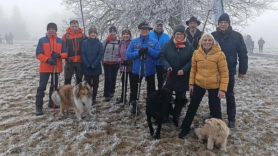 Oben angekommen wartete eine besondere Überraschung: Zwei weitere Mitglieder des Rhönklubs Wildflecken empfingen die Wanderer mit heißem Glühwein, Tee und Stollen. Gestärkt ging es gemeinsam weiter zum Gipfelkreuz, wo der offizielle Teil der Veranstaltung begann.