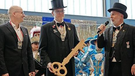 Nun, am Faschingsdienstag, stand das Ende der närrischen Zeit bevor – und so mussten die Karnevalisten beides schweren Herzens dem Oberbürgermeister Dirk Vogel wiedergeben. Garitz’ Sitzungspräsident Christian Rüth warnte, dass die Narren das ganze Geld genommen haben. Dirk Vogel will das nicht so recht glauben. „Habt ihr überhaupt etwas gefunden?“, fragt er. Nun ja, die klamme Haushaltslage der Kurstadt ist natürlich auch den Narren bekannt. Der OB hat versöhnliche Worte an Fidelia und Garitz übrig: „Es gilt sie zu loben, unsere Faschingsvereine mit ihrem herausragenden Nachwuchs. Es ist schön, dass es sie gibt, sonst wäre Fasching nicht nur trocken, sondern auch langweilig.“