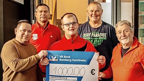 „Hand in Hand“-Vorsitzender Günter Kolb (rechts) und Zweiter Vorsitzender Nick Gallenz (links) freuten sich, aus den Händen von Fanclub-Vorsitzendem Xaver Postler (Zweiter v.l.) und Vorstandsmitglied Heiner Senger (Mitte) den Scheck entgegenzunehmen; mit auf dem Bild ist Marcel Senger, Mitarbeiter der Lebenshilfe-Werkstätten. FC Bayern Fanclub