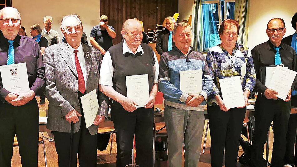 Anschließend ehrten Christopher Janßen und Annette Eichhorn langjährige Vereinsmitglieder. Geehrt wurden die beiden ehemaligen Vorsitzenden Erich Dremel und Johann Kalenyak für 25 Jahre sowie Otto Bleyer und Erwin Mühlbauer für 40 Jahre aktive Mitgliedschaft. Michael Schütz und Brigitte Martin wurden für 25 Jahre passive Mitgliedschaft geehrt, genau wie Josef Hoh und Marianne Keck für 40 Jahre passive Vereinszugehörigkeit. Für bemerkenswerte 50 Jahre als förderndes Mitglied des Vereins erhielt Hans Schütz die Urkunde. Zusätzlich wurden die aktiven Jubilare noch mit der Ehrennadel und Urkunde des Fränkischen Sängerbundes ausgezeichnet.