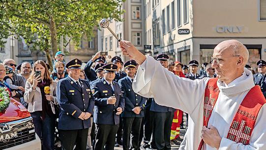 Zahlreiche Angehörige der Feuerwehr, Vertreter der Stadt sowie viele interessierte Passanten hatten sich vor der Kirche St. Martin eingefunden, um an der Segnung von sechs neuen Fahrzeugen der Feuerwehr teilzunehmen, heißt es in einer Pressemitteilung der Stadt.