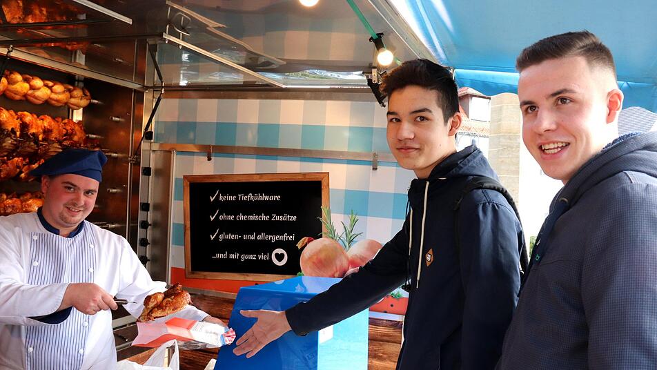 Gabriel (15) und Alexander (19) Münch, zwei junge waschechte Adelsdorfer, haben sich endlich in der langen Schlange vorgearbeitet und freuen sich auf ihre Mittagsmahlzeit. "Ich komme grade aus der Schule in Höchstadt, und weil ich oft richtig Lust auf Hähnchen hab, bin ich nicht nur heute hier", erklärt er strahlend. "Mir schmecken Hähnchen einfach und die hier besonders."