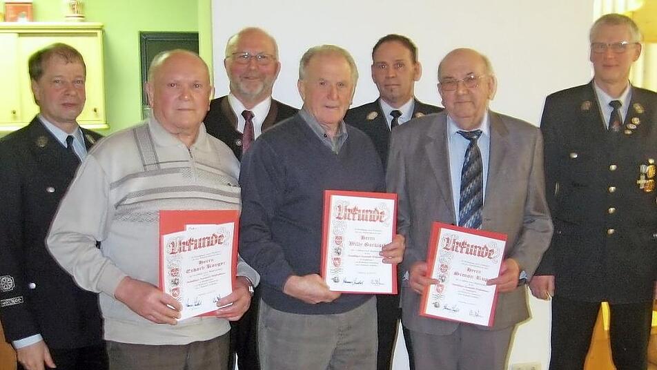 Bürgermeister Egon Herrmann zeigte sich erfreut über das ehrenamtliche Engagement in der Feuerwehr. Er lobte die gute Zusammenarbeit und den guten Zusammenhalt unter den Vereinen. Er nahm zusammen mit Vorsitzendem Christian Höfner die Ehrungen vor. Es wurden geehrt: Für 65 Jahre Erhard Korger. Für 60 Jahre Rudolf Volk, Simon Rupp, Willy Garkisch und Horst Schmidt. Für 50 Jahre Werner Müller. Für 25 Jahre Gerhard Tenner, Marcus Feulner, Mark Elflein. eh