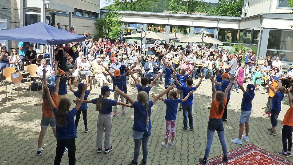 Im Mittelpunkt der Geburtstagsfeier standen die aktuell 97 Schülerinnen und Schüler aus den fünf Grundschulklassen. Für die Eröffnung der gut besuchten Feier sorgten die Jeki-Bläser, die Kinder der vierten Klassen sangen das von Horst Weber geschriebene Schullied, die Klasse 3 a führte den Tanz „Back to the seventiens“ auf, der auch Klassen- und Schulleiterin Daniela Drummer rocken ließ, und zum Schluss des offiziellen Teils sangen alle Kinder das Lied vom „Vugelbeerbaam“.
