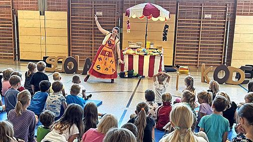 o wurde auf Einladung des Fördervereins für alle Grundschulklassen das Stück „Die Händlerin der Worte und die gestohlenen Wörter“ in der Turnhalle aufgeführt.
