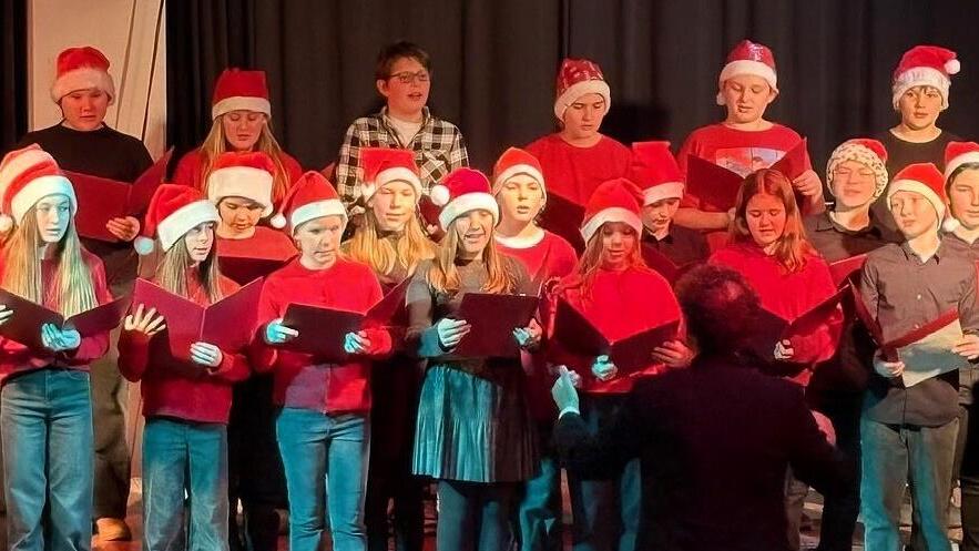 Der rot gekleidete Unterstufenchor mit Nikolausmützen unter der Leitung von Christian Moll bewies mit den zwei englischsprachigen Weihnachtsliedern „O Holy Night“ und „The First Noel“ erstaunliche Textsicherheit. Mit der Junior-Bigband fanden über 30 junge Leute und ihre Bandleiterin Schuler auf der Bühne ihren Platz. Nach Startschwierigkeiten meisterten auch diese mit der patriotischen amerikanischen Hymne „Glory Glory Hallelujah“ stimmungsvoll ihren Auftritt.