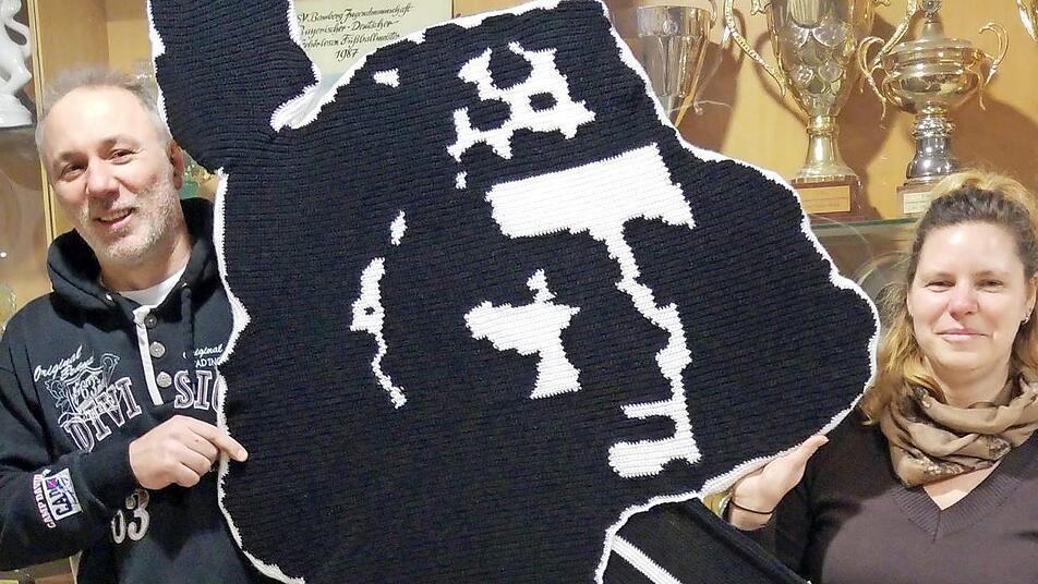Ramona und Thomas Öhrlein mit dem gehäkelten XXL-Vereinswappen Foto: Peter Krauseneck
