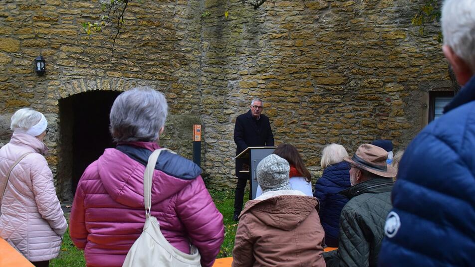 Am sogenannten Dicken Turm im Umfeld der ehemaligen Synagoge steht die Stele als Teil der Natur- und Geschichtszeichen Mainbernheims. Auf der anderen Seite der Stadtmauer ist die Gedenktafel angebracht. Gut 40 Bürgerinnen und Bürger waren der Einladung von Bürgermeister Peter Kraus zur Feierstunde gefolgt. Zu den Mitorganisatorinnen zählten Susanne Pfeifer, Vorsitzende der Altstadtfreunde, und Gerlinde Wagner, die im Förderverein ehemalige Synagoge Kitzingen und im Arbeitskreis des Netzwerkes mitarbeitet.