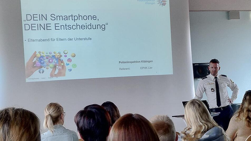 Diese bayernweite Präventionskampagne des Bayerischen Landeskriminalamts hat zum Ziel, auch Eltern über die Gefahren und möglichen Folgen im Zusammenhang mit der Nutzung von Smartphones umfassend zu informieren und im Umgang mit dem Handy zu sensibilisieren. Alexander Lier, der stellvertretende Dienststellenleiter der Polizeiinspektion Kitzingen, informierte die zahlreich erschienenen Eltern mit Hilfe einer anschaulich gestalteten Powerpoint Präsentation über das Posten von problematischen Texten und Bildern, das Smartphone als Tor zu problematischen Inhalten sowie die Opferrolle von Kindern.