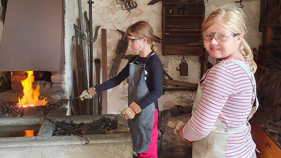 Dass die Zeit sehr unterschiedlich empfunden werden kann, merkten auch die Mädchen und Jungen, die sich für das "Schmieden mit Kindern" angemeldet hatten. Nach einer kurzen Einweisung konnten sie selber an Esse und Amboss arbeiten. Manchmal klappte es wie am Schürchen: Das Eisen hatte die richtige Temperatur, es wurde korrekt auf den Amboss gehalten und der Hammer traf mit der richtigen Kraft am richtigen Punkt. Die Zeit verging wie im Flug. Und manchmal ging es überhaupt nicht voran: Das Eisen wurde nicht heiß oder verbrannte, es wurde falsch gehalten, so dass es sich verbog, der Hammer hatte nicht die richtige Kraft oder traf nicht den vorgesehenen Punkt. – Und die Zeit wurde lang.