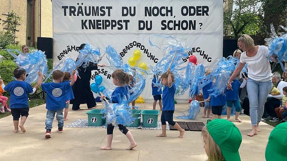 Nach der abwechslungsreichen Aufführung der Kinder zur Kneippschen Lehre, konnten alle auf der Spielstraße verschiedene aktive Stationen mit den fünf Elementen durchlaufen. Des Weiteren wurden gesunde Snacks und Getränke angeboten und es gab Kräuterstationen zum Probieren und Kennenlernen. Beim Kneipp-Quiz gab es für die Familien Fragen zum Thema zu beantworten. Die vielen Preise, die wir vergeben konnten, wurden uns aus großzügigen Spenden örtlicher Unternehmen und von Spielzeugfirmen überlassen. Die T-Shirts der Kinder für die Aufführung wurden uns von der Sparkasse Iphofen gespendet.