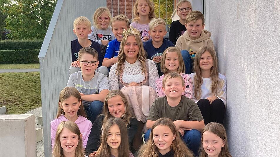 Königlichen Besuch erhielt die 4. Klasse der Grundschule Willanzheim. Marie I., ihres Zeichens Weinprinzessin von Seinsheim, stattete den Mädchen und Buben einen Besuch ab. Nachdem die Kinder bereits im Weinberg des Weingutes Zehntkeller in Iphofen bei der Lese helfen durften und eine Führung durch die dortigen Weinkeller erhielten, war der Besuch der Weinhoheit der krönende Abschluss dieser Unterrichtseinheit. Sehr anschaulich erzählte Marie den gespannten Zuhörerinnen und Zuhörern von ihrem "Alltag" als Weinprinzessin. So erfuhren die Kinder u.a., wie wichtig Blasenpflaster, Ersatzstrumpfhosen, Autogrammkarten und ein Perlenanhänger zur Kennzeichnung des eigenen Weinglases sind. Natürlich durften auch die Kronen nicht fehlen, denn der Markt Seinsheim verfügt tatsächlich über drei. Zum Schluss dieser gelungenen Unterrichtsstunde gab es neben einer süßen Überraschung selbstverständlich noch ein Klassenfoto der Kinder zusammen mit "ihrer" Weinprinzessin.