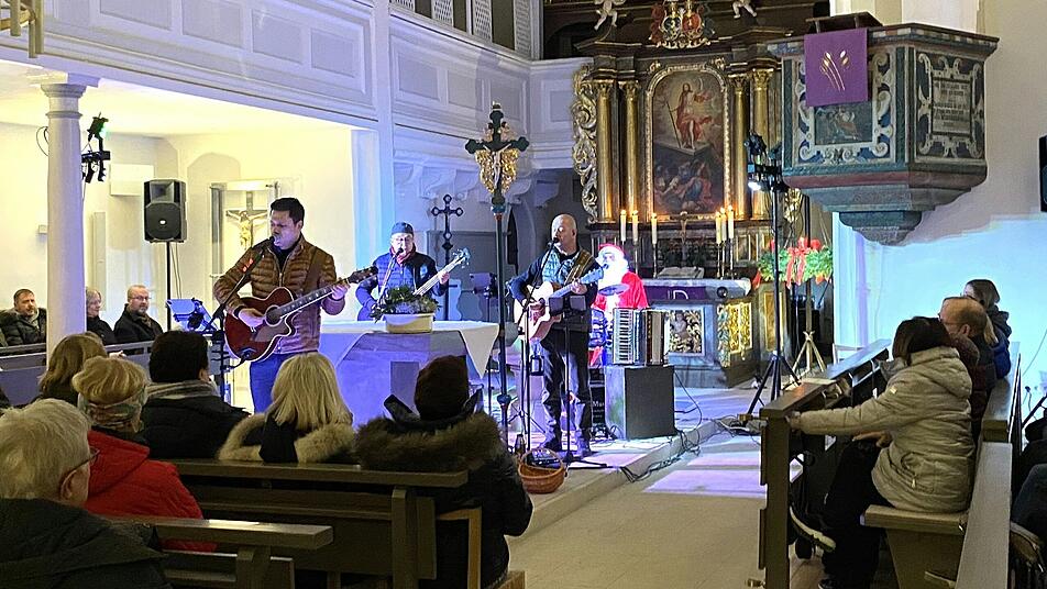 Die vier Musiker der Volkacher Band mit Gitarrist Udo Quicher, Ralph Wachter am Bass, dem Weihnachtsmann, dessen Identität geheim blieb, als Percussionist, Bandleader und Moderator Manuel Pietro mit seinem Gesang und Gitarrenspiel heizten den Gästen mit ihren Oldies aus den 60er bis 80er Jahren kräftig ein. In ihrem breiten Repertoire gab es eine bunte Mischung aus Evergreens, Elvis und Beatles Hits sowie italienische und spanische Songs. Aber auch deutsche Liedermacher wie Rolf Zuckowski und Peter Maffay mit seinem Tabaluga sowie Marius Müller-Westernhagen wusste die Band stimmungsvoll zu interpretieren. Als am Ende als Zugabe das bekannte Feliz Navidad erklang, hielt es niemanden mehr auf der Sitzbank. Da vor der Kirche noch Glühwein angeboten wurde, war es ein wundervoller Konzertabend in kirchlicher Atmosphäre.