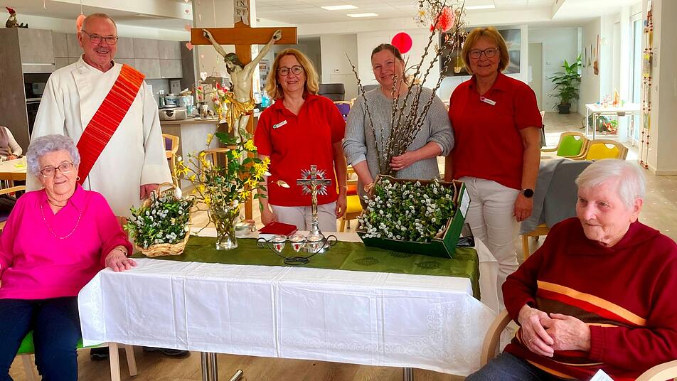 Mit dem Prozessionskreuz der Stadtschwarzacher Pfarrkirche "Heilig Kreuz" und den Palmzweigen der Palmprozession vom Palmsonntag wurden die Gäste der Caritas-Tagespflege St. Hedwig hineingenommen in das Geschehen zu Beginn der Karwoche in Jerusalem.
