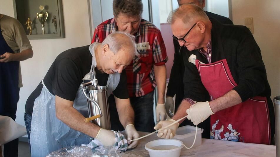 Mit großem Eifer waren die Männersportler bei der Sache und zeigten sich äußerst kreativ. Der Nebenraum der Turnhalle wurde eigens in eine Wurstküche umfunktioniert, um gemeinsam frische Bratwürste zuzubereiten. So wurde nach verschiedenen Rezepten gewürzt, Naturdarm auf das Füllhorn zweier mit Brät gefüllter Wurstfüllmaschinen aufgezogen sowie die lange Bratwurstschlange anschließend per Hand abgedreht.
