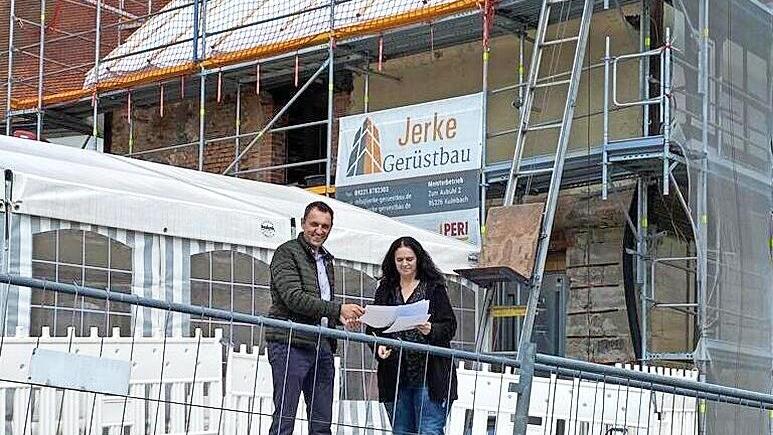 Derzeitige Arbeiten sind der Austausch des schadhaften Gebälks (Böden, Decken, Wände) nach den Vorgaben des Denkmalschutzes . Hiervon ist aufgrund der Einrüstung von außen kaum etwas zu sehen. Diese Arbeiten nehmen aber einen längeren Zeitraum in Anspruch, informierte das Gemeindeoberhaupt vor Ort an der Baustelle .