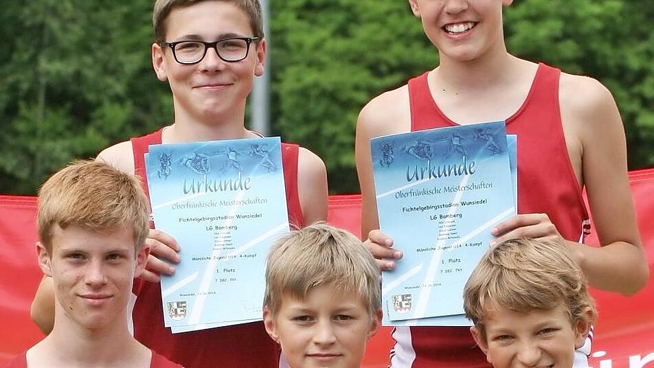 Seine Vereinskameraden starteten alle schon in der M13. Hier holte sich Nils Urbanek knapp geschlagen die Silbermedaille mit 1668 Punkten. Er punktete vor allem im Hochsprung mit einer neuen persönlichen Bestleistung von 1,46 Metern und im Ballwurf mit der Bestweite von 40 Metern. Leo Folgmann erreichte den guten vierten Platz mit 1553 Punkten. Auch er profitierte von seinem guten Hochsprung-Ergebnis von 1,42 Metern.Platz 5 belegte Julius Lehner mit 1457 Punkten, Achter wurde Ioannis Mitsioulis mit 1346 Zählern. Durch diese guten Einzelleistungen holten sich die fünf Athleten der LGB in der Mannschaftswertung den Meistertitel vor der LG Fichtelgebirge. Im Vierkampf der WU18 testete Jana Kraus ihre Vielseitigkeit. Mit 2237 Punkten siegte sie vor Isabel Keil (1549) aus Bayreuth.