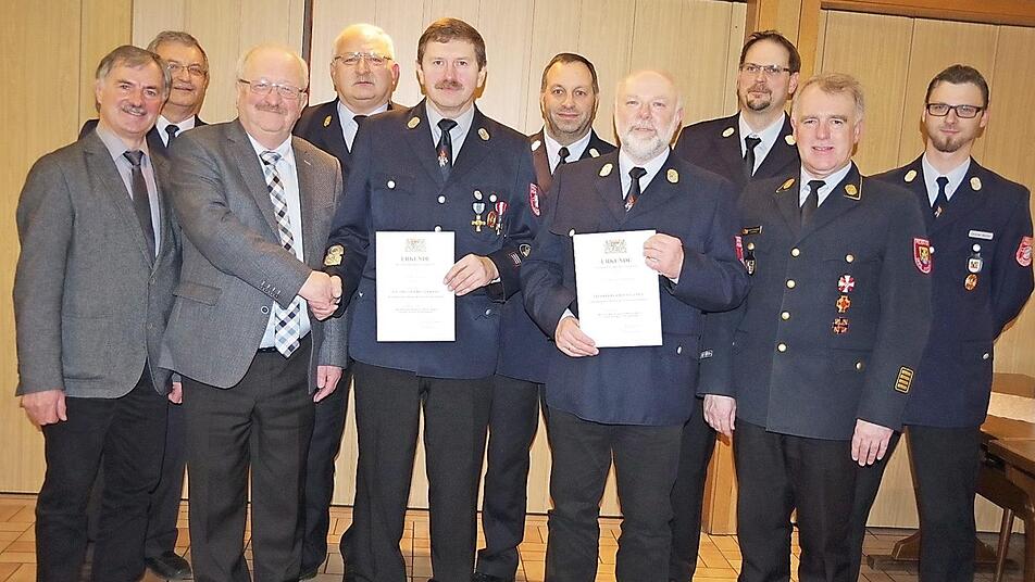 Thomas Stadelmann und Herbert Agel wurden für 40 Jahre aktiven Dienst mit dem Staatlichen Ehrenzeichen in Gold ausgezeichnet. Die Ehrungen wurden von stellvertretendem Landrat Bernd Steger sowie KBR Joachim Ranzenberger vorgenommen. Steger freute sich sehr, mit den beiden zwei "Urgesteine" im besten Sinne der Wehr ehren zu dürfen, die seit ihrem Eintritt 1978 hohe Verantwortung innerhalb der Wehr tragen.