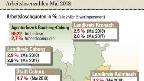 Im Agenturbezirk Bamberg-Coburg sank die Zahl der Arbeitslosen im Mai wieder unter die 10 000-Personen-Marke auf 9522. Seit dem Vorjahr sank die Zahl der Arbeitslosen um 773 Personen bzw. 7,5 Prozent.
