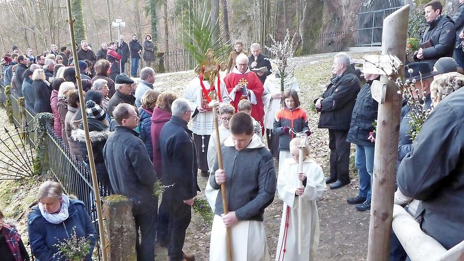 Mit dem Palmsonntag beginnt die heilige Woche oder auch Karwoche genannt. Traditionell fand die Segnung der Palmzweige in Gößweinstein vor der Ölberggrotte statt.
