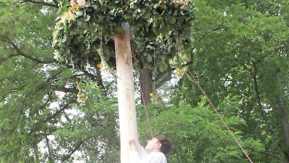 Der Baum war schon am Samstag aufgestellt worden, genauso wie die Kinderkrone. Über ein Metallgestell werden Eichenbuschen befestigt und Blumensträuße eingebunden. Für das Binden der beiden Kronen zeichnete die "Nachbarschaft Herzogenaurach" verantwortlich. Derartige Gemeinschaftshilfen gab es schon in Siebenbürgen, sie sorgten für ein gutes Zusammenleben auch in Notsituationen.
