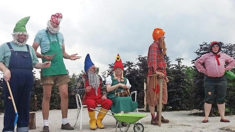 Am Samstag, 9. Juni, unterhalten die Schauspieler der Stettfelder Freilichtbühne die Gäste der Landesgartenschau in Würzburg. Von 11 bis 12 Uhr sind sie auf der Tribüne "Alter Park" zu sehen. Im Gepäck haben sie kurze Stücke: die "Gartenzwerg-Impressionen" von Birgit Amling und "Shakespeare gut durchgschüddeld" von Christian Ziegler. Im ersten Spiel erwachen sechs Gartenzwerge in einem Trödelladen zum Leben. In gereimter Form und gespickt mit bissigen Seitenhieben unterhalten sie sich über ihr Leben, die Gartenkultur und die Veränderungen, die die Wohlfühl-Oase Garten durchlaufen hat. Im zweiten Einakter probt eine Theatergruppe ein neues Stück ein. Gegen alle Widerstände fällt die Wahl auf Shakespeare. Die Szene aus dem Sommernachtstraum verwandelt sich für die Regisseurin schnell in einen theatralischen Alptraum erster Güte. Unser Bild zeigt eine Szene aus den Gartenzwerg-Impressionen. Foto: Maria Klarmann