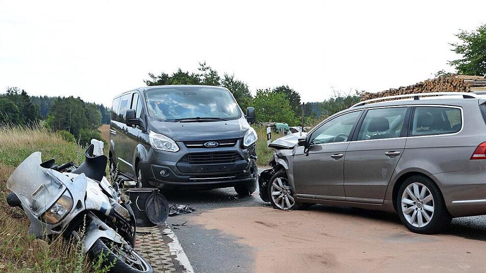 Zu einem schweren Verkehrsunfall kam es am Mittwochnachmittag gegen 14 Uhr auf der Verbindungsstraße zwischen Burgkunstadt und Stadelhofen. Ein 46-jähriger Motorradfahrer aus dem Kreis Bamberg war auf der kurvenreichen Strecke in Richtung Kleinziegenfeld unterwegs, als er rund 500 Meter vor dem Ortseingang von Kleinziegenfeld zum Überholen eines Transporters ansetzte. Dabei übersah er jedoch den sich nähernden Gegenverkehr. Beim Wiedereinscheren touchierte er einen entgegenkommenden VW Passat. Aufgrund des Zusammenstoßes stürzte der Kradfahrer und wurde dabei schwer verletzt. Die vier Insassen des Passat wurden leicht verletzt, als der Passat infolge der Kollision mit einem Ford-Kleintransporter zusammenstieß. Die Fahrerin des Ford wurde ebenfalls leicht verletzt. Die Polizei schätzt den Schaden an den drei Fahrzeugen auf 50 000 Euro. Foto: Frank Spitzenpfeil