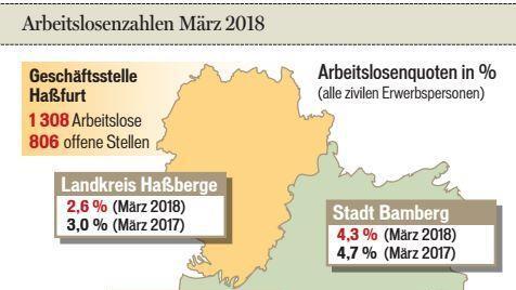 Die Arbeitslosigkeit im Landkreis Haßberge geht weiter zurück. Die Zahl der Erwerbslosen hat sich von Februar auf März um 105 Personen auf 1308 Arbeitslose verringert. Die Arbeitslosenquote im Landkreis liegt aktuell bei 2,6 Prozent. 806 offene Stellen stehen bereit. Diese Zahlen nannte die Agentur für Arbeit in ihrem Monatsbericht für den zu Ende gehenden März.
