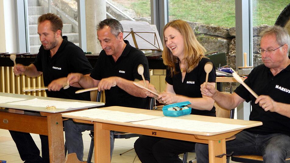 Schwaabe betätigte sich auch als Moderatorin und sauste mit ihrem Mikrofon durch die Reihen der Kinder, als sie nach dem Namen des Instruments fragte, auf dem sich Guido Marggrander und Christian Pilz ein Duell liefern. Es war die Djembe, eine becherartige Trommel. Mit den Kindern ging sie auf eine weitere Reise durch das Schlagwerk-Spektrum, bis man an das große Metallinstrument kam, bei dem die Klangstäbe in Form einer Klaviatur angeordnet sind. Ursprünglich aus Afrika und mit ausgehöhlten Kürbissen als Resonatoren umfasst die Marimba fünfeinhalb Oktaven. Und mit verschiedenen Schlägern zauberte der Spieler die tollsten Klänge hervor, wie das jazzige "Look out little ruth" von Kurt Engel. Als Höhepunkt folgte dann auf der Marimba "Ghaneia", ein Klassiker des Würzburger Komponisten Matthias Schmitt, der inzwischen weltweit bei Marimba-Wettbewerben gespielt wird.