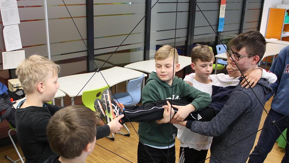 Die Begeisterung der Jugendlichen zog sich durch alle Workshops. Bei der Expedition auf eine verbotene Insel mussten unter Anleitung von Sigi Weidlich von der Evangelischen Jugend im Dekanat Rügheim und Jeremy Vernon vom CVJM Altenstein im Forscherteam Gefahren und Aufgaben auf einer verbotenen Insel gelöst werden. Da hieß es für Tristan, Maxi, Leon, Eric und Jonas, ihr "Opfer" Moritz vorsichtig durch ein fiktives Spinnennetz zu ziehen.