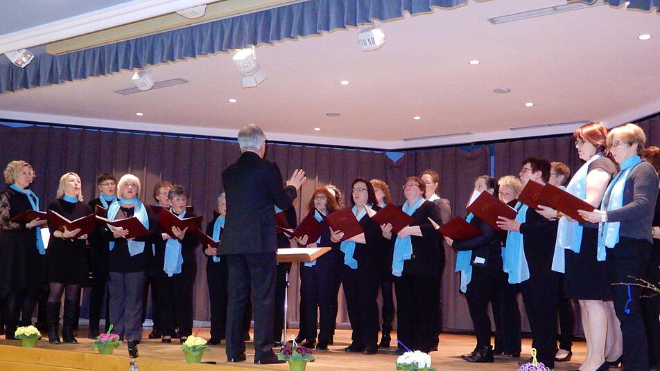 Chorleiter Norbert Weis hat den Frauenchor "Vocalitas" aus Oberhaid voll im Griff. Bei "Es klingt ein Lied" mit dem Text und der Melodie von Otto Grell glänzte er selbst mit einem Solo. Nach zwei weiteren Vorträgen war bei "Only you" die Bühne für die Gäste aus Oberfranken fast zu klein.