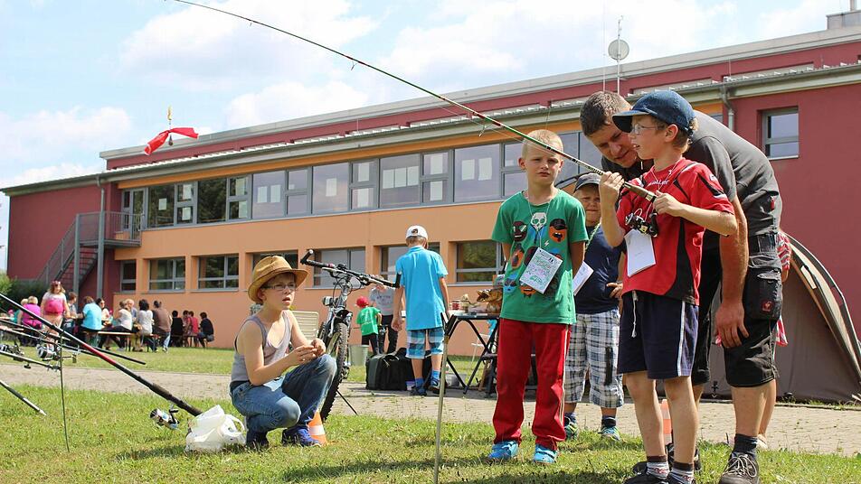 Im Schulgebäude selbst warteten die Neubrunner Dorfmusikanten mit einer Auswahl an Blechbläsern. Schnell fanden sich hier Talente wie Paul, der gleich mehreren der schwierigen Instrumente lange Töne entlockte. Die Ministranten boten ein Fotoshooting in Ministrantenkleidung und das Basteln eines Holzkreuzes mit passender Kette an. Die in Kirchlauter bekannte "I have a dream"-Gruppe gestaltete einen Parcours mit verbundenen Augen. Es gab Tanz in der Turnhalle und Wasser spritzen mit der Feuerwehr. Der Angelverein Breitbrunn hatte eine Karpfenausrüstung, eine kleine Fischausstellung und einen selbst gemachten Angelteich aus Bettlaken mitgebracht und Imkervereinsvorsitzender Peter Kirchner seine Bienen.