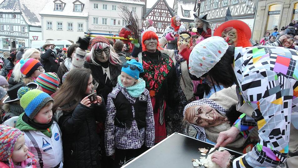 Auf dem Marktplatz lasen die wilden Hexen dem Bürgermeister die Leviten. Gefangen musste sich das Stadtoberhaupt seine Sünden anhören: Hat er doch (zur Stadtverschönerung im Jubiläumsjahr) "über Nacht die Grünanlagen platt gemacht". Jetzt sieht man den Müll, und die Hexen drohten gleich auch den Bürgern: "Lasst euren Müll schön daheim und werft ihn in die Tonne rein!"