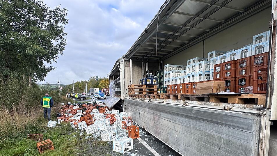 Der hauptsächlich mit Saft- und Wasserflaschen beladene Laster wollte laut Polizeiangaben gegen 07.30 Uhr von der Staatsstraße 2692 auf die Bundesstraße einbiegen, als er in der Kurve von Berg kommend einen Teil seiner Ladung verlor.