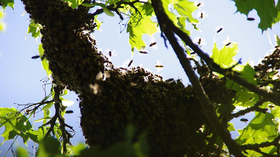 Imker Thorsten Hugel wurde zu Hilfe gerufen, um die Bienen aus fünf Metern Höhe aus einer Baumkrone zu holen. Dort hatte der Schwarm einen Stopp eingelegt. Der Fachmann erklärte auf unsere Nachfrage, dass das Schwärmen dann eintritt, wenn eine neue Königin schlüpft. Die alte Königin macht sich zu dieser Zeit auf die Suche nach einem neuen Stock, "mit ungefähr der Hälfte der Bienen und 20 Kilo Honig in den Bäuchen".