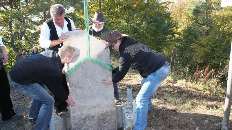12.30 Uhr: Der Samelstein ist in seiner Heimat angekommen. Volksfeststimmung macht sich breit. Es gibt Weißwürste und Brötchen. Mit einem Kran wird das Denkmal behutsam, in das mit Schotter ausgelegte und von der Interessengemeinschaft gebaute Fundament gestellt. "Der Schotter sorgt dafür, dass das Wasser ins Erdreich abfließen kann und es im Winter zu keinen Frostschäden kommt", erklärt Gerhard Kögel, Inhaber der gleichnamigen Zimmerei aus Schimmendorf. Anschließend wird das hölzerne Dach errichtet, das den Samelstein vor Wind und Wetter schützen soll.