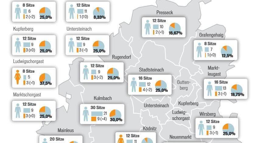 Von den 304 Stadt- und Gemeinderäten im Landkreis Kulmbach sind 67 weiblich (plus 19) und 237 männlich. Spitzenreiter bei der Frauenquote ist der Gemeinderat in Himmelkron mit 43,75 Prozent (7 Frauen bei insgesamt 16 Gemeinderatssitzen). Respektabel auch die Frauenquote im Kulmbacher Stadtrat mit 30 Prozent; ihm gehören künftig neun Frauen an, das ist immerhin ein Plus von vier Rätinnen. Schon immer stark vertreten war das weibliche Geschlecht in Ludwigschorgast, wo der neu gewählte Rat (3 Frauen und 5 Männer) erneut mit einem Frauenanteil von 37,5 Prozent hervorsticht. In Trebgast hat sich der Frauenanteil verdoppelt: Seit März sind hier zwei Frauen im Gemeinderat tätig. Ausbaufähig ist der Frauenanteil in Grafengehaig, Harsdorf, Ködnitz und Wonsees, wo jeweils lediglich eine Frau dem Gemeinderat angehört.