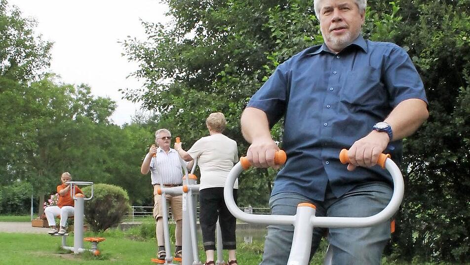 Etwas merkwürdig sehen die grau-orangefarbenden Gebilde rechts im Eingangsbereich des Bad Staffelsteiner Kurparks schon aus. Menschen bewegen ihre Beine auseinander, drehen sich im Stehen und Sitzen oder simulieren an einem Gerät das Laufen auf Skiern. Gleich neben dem Ki osk, trainieren sie ihre Arm- und Beinmuskulatur.