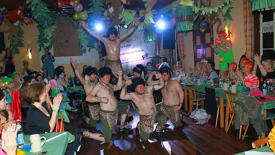 Alle machten mit, die typischen Handbewegungen waren rasch in Fleisch und Blut übergegangen.Der absolute Höhepunkt des Abends war aus Sicht der Frauen der Tanzauftritt des Stublicher Männerballetts "Schießer Feinribbdänzer" - direkt aus dem Dschungel nach Stublang in den Saal. Die spärlich bekleideten "Schießer Feinribbdänzer" zogen bei ihren Tänzen so manchen Frauenblick auf sich. Es hielt keine Frau mehr auf ihren Platz, und die "Security" konnte nur mit viel Mühe das Stürmen der Tanzfläche verhindern. Denn das närrische Frauenvolk tobte, als Thomas Eck, Markus Weidner, Bernhard Weidner, Klaus Römert, Christian Stark und Andy Glowatzki ihren Aufritt hatten.