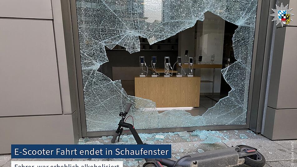 Zeugen sahen den Mann gegen 1.40 Uhr auf dem Gehweg der Ludwigstraße. Er fuhr mit einem E-Scooter, verlor die Kontrolle und prallte so heftig gegen die Scheibe eines Geschäfts, dass die Feuerwehr sie später verschalen musste. Der 33-Jährige erlitt leichte Verletzungen im Gesicht.