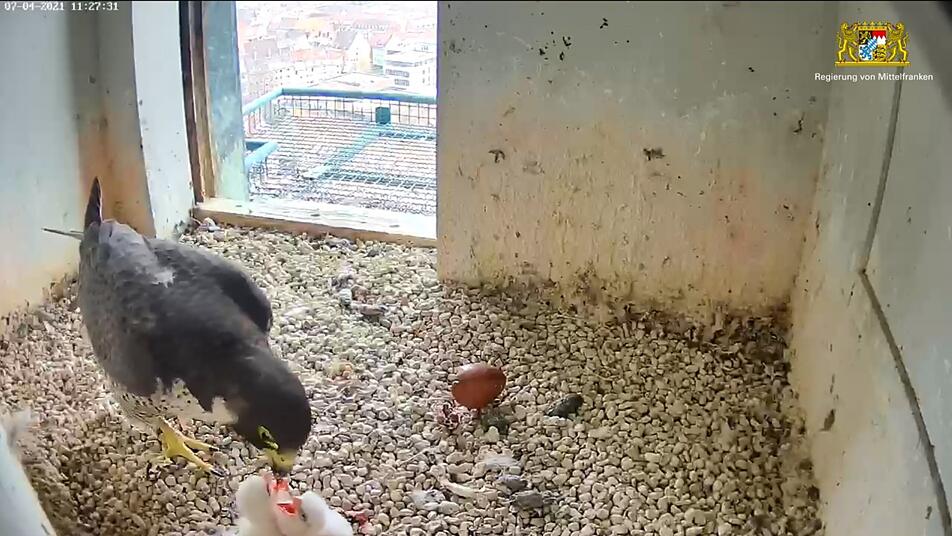 Seit 2013 brüten Wanderfalken auf dem Sinwellturm der Nürnberger Kaiserburg. In diesem Jahr hat die Brutsaison der Wanderfalken mit der Eiablage am 28. Februar sehr früh begonnen. Das Wanderfalkenpaar hat ihre vier Eier nun über einen Monat lang gebrütet, bis gestern, in der Nacht zum 07. April, gleich zwei Wanderfalkenküken geschlüpft sind.