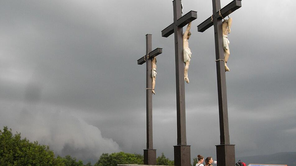 Der mag zwar Technik-Freunde faszinieren, Pause macht man aber besser unweit des Gipfels (928 Meter) an den berühmten drei Golgatha-Kreuzen, die am Ende des Stufen-Kreuzwegs stehen. Hier oben ist man vor allem um die Mittagszeit fast nie allein, jede Menge Kreuzberg-Besucher, die die Aussicht genießen wollen, kommen herauf.