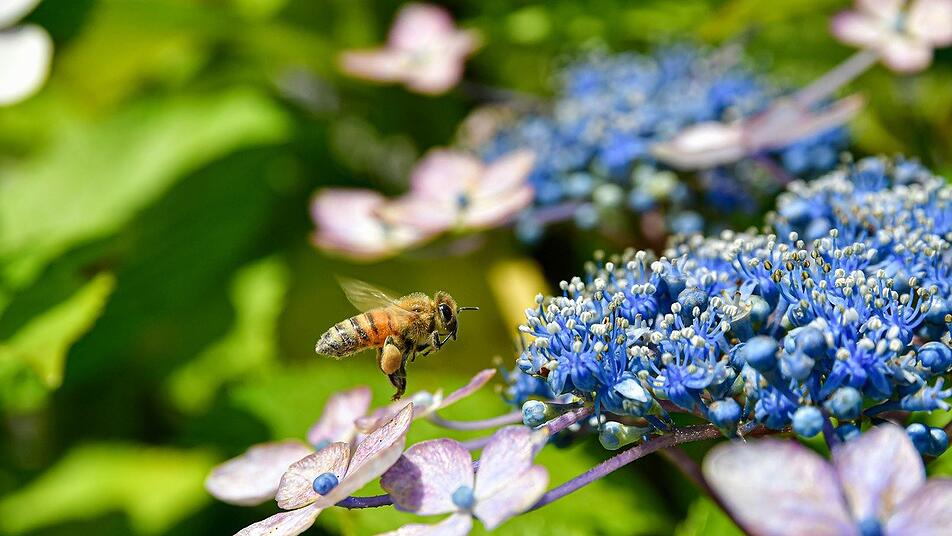 - Hydrangea serrata "Summer Glow" – ihre zweifarbigen Blütenstände sind eine Augenweide. Das Innere der Dolden hat eine weiß-gelbe Farbe, außen bestechen sie durch eine blaue bis rosa Tönung, die je nach pH-Wert des Bodens variiert. Sie blüht zwischen Juni und September und ist daher eine prima Nahrungsquelle für Insekten, denn in diesen Monaten sind die Tiere besonders aktiv. Auch ihre dunkelgrünen Blätter haben eine beeindruckende Eigenschaft, weil sie sich im Herbst in ein intensives Dunkelrot verfärben. Die Berghortensie entwickelt sich zu einer breiten und buschig aussehenden Staude und erreicht eine Höhe zwischen 1 und 1,5 Metern. Aufgrund ihrer Statur ist sie sehr gut für die Kübelbepflanzung geeignet. Diese Sorte liebt einen halbschattigen und geschützten Standort.