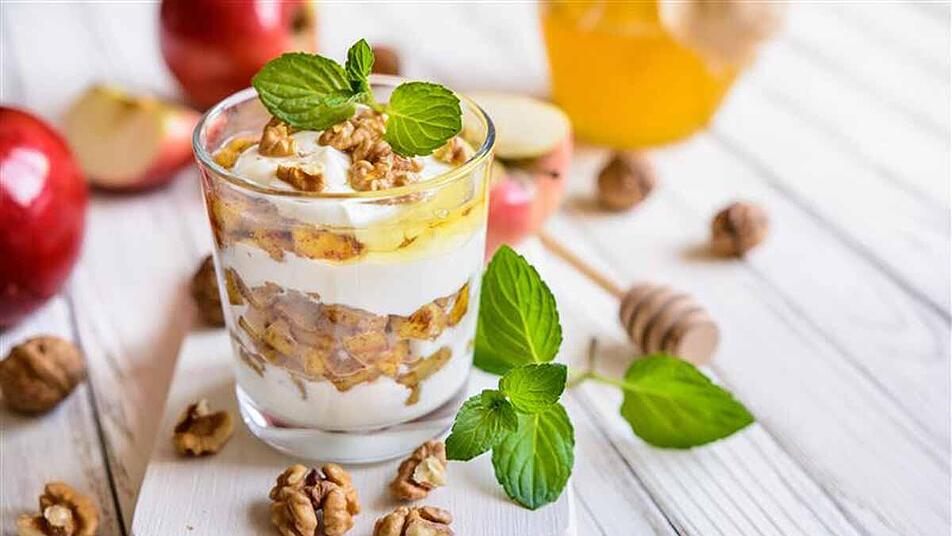 - Ein Drittel der Creme auf die Gläser verteilen. Dann die Hälfte karamellisierten Äpfel und Walnüsse auf die Creme geben und wieder mit einem Drittel der Quark-Creme bedecken. Das ganze nochmals wiederholen, sodass das Glas mit einer Schicht Quark-Creme abschließt.