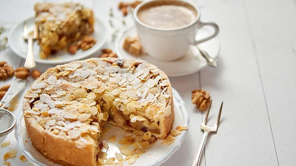 - Die Äpfel werden geschält, entkernt und geviertelt. Beträufle sie mit etwas Zitronensaft, damit sie nicht braun werden. Wer mag, kann auch Rosinen untermischen. Verteile die Apfelstücke gleichmäßig auf dem Teigboden und streue die Mandelblättchen darüber.