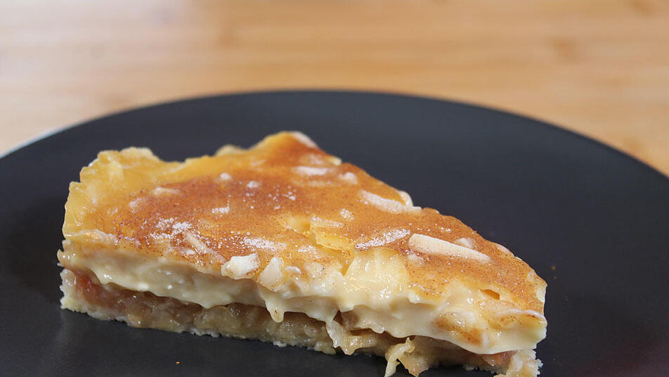 - Den Teig auf dem Boden der Springform verteilen, dabei darauf achten, dass er überall gleich dick ist. Die geriebenen Äpfel auf dem Teig verteilen. Die Puddingcreme über die Äpfel gießen und gleichmäßig verteilen. Zum Schluss mit den Mandelblättchen und dem Zimtzucker bestreuen.