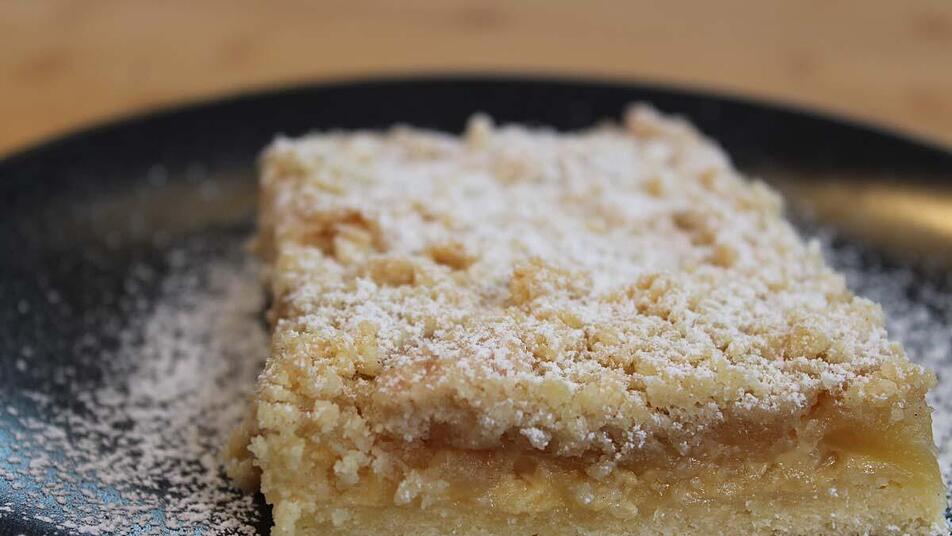 - Anschließend wird zunächst der Vanillepudding auf den Teig gegeben und glatt gestrichen, danach machen wir das selbe noch mit der Apfelmasse. Zum Schluss noch die Streusel gleichmäßig auf dem Apfelkuchen verteilen.