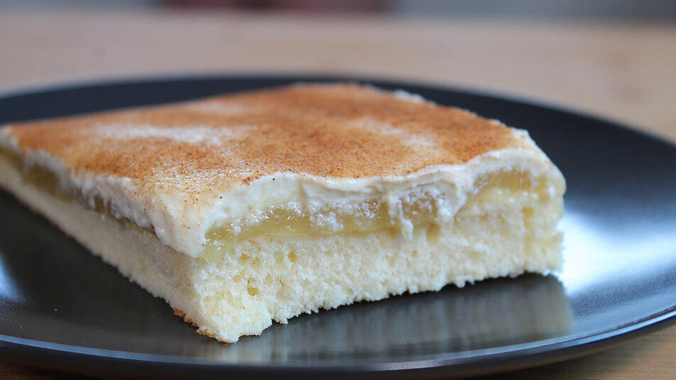 - Sahne steif schlagen und mit Schmand und etwas Vanillepaste mischen. Die Creme auf die Apfelmus-Schicht streichen und alles mit Zimt-Zucker bestreuen. Den fertigen Apfelmuskuchen für 2 Stunden in den Kühlschrank stellen und anschließend genießen.