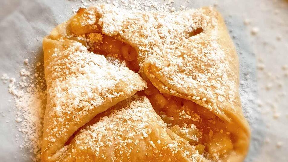 - Die Apfelmasse gleichmäßig auf den Blätterteigplatten verteilen, die Ecken zur Mitte klappen und so kleine Taschen formen.