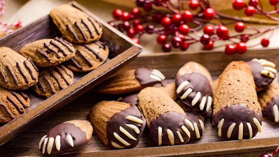 - Die abgekühlten Kekse kannst du dann noch in geschmolzener Schokoladen-Kuvertüre tunken und mit Mandelsplittern als Krallen verzieren.